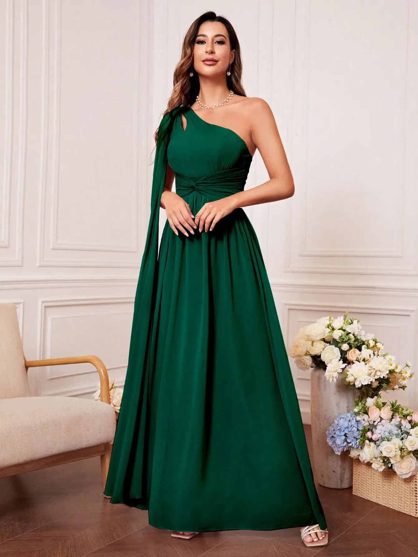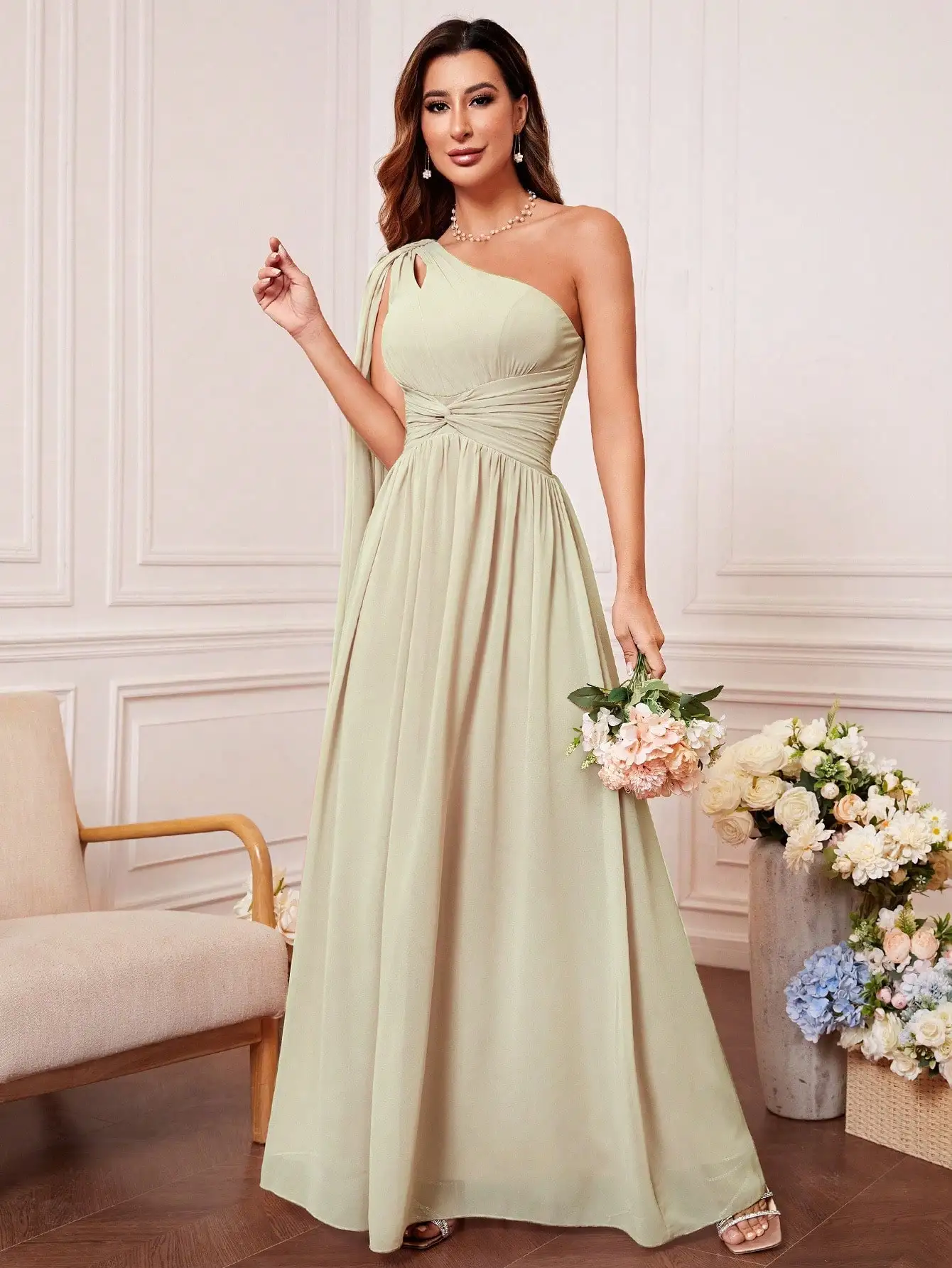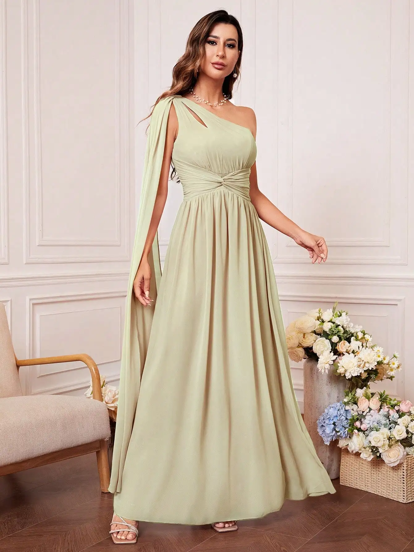 Bridesmaid dress with tie front, one shoulder, cut out, uniform