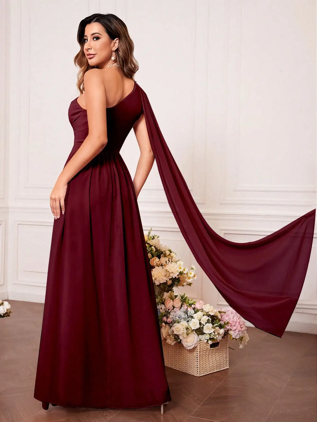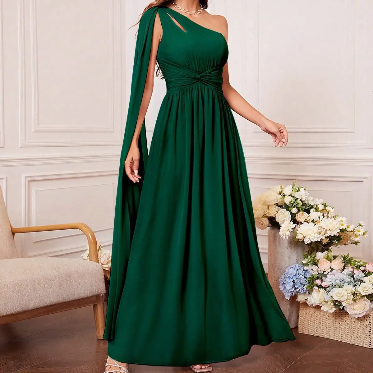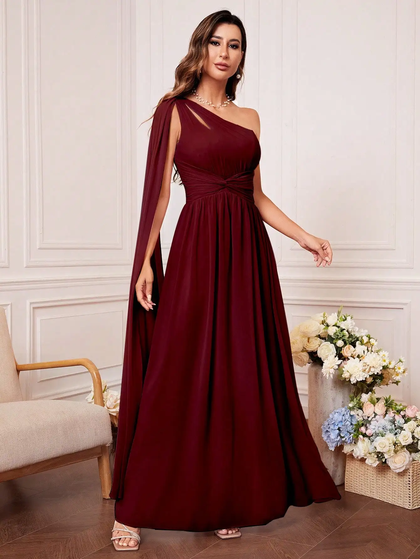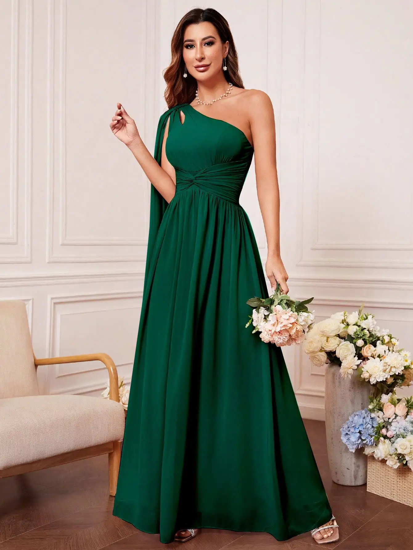 Bridesmaid dress with tie front, one shoulder, cut out, uniform