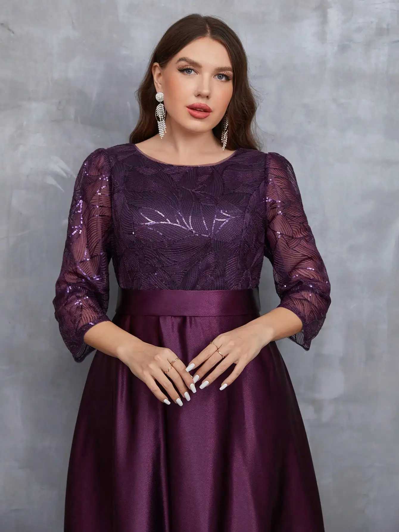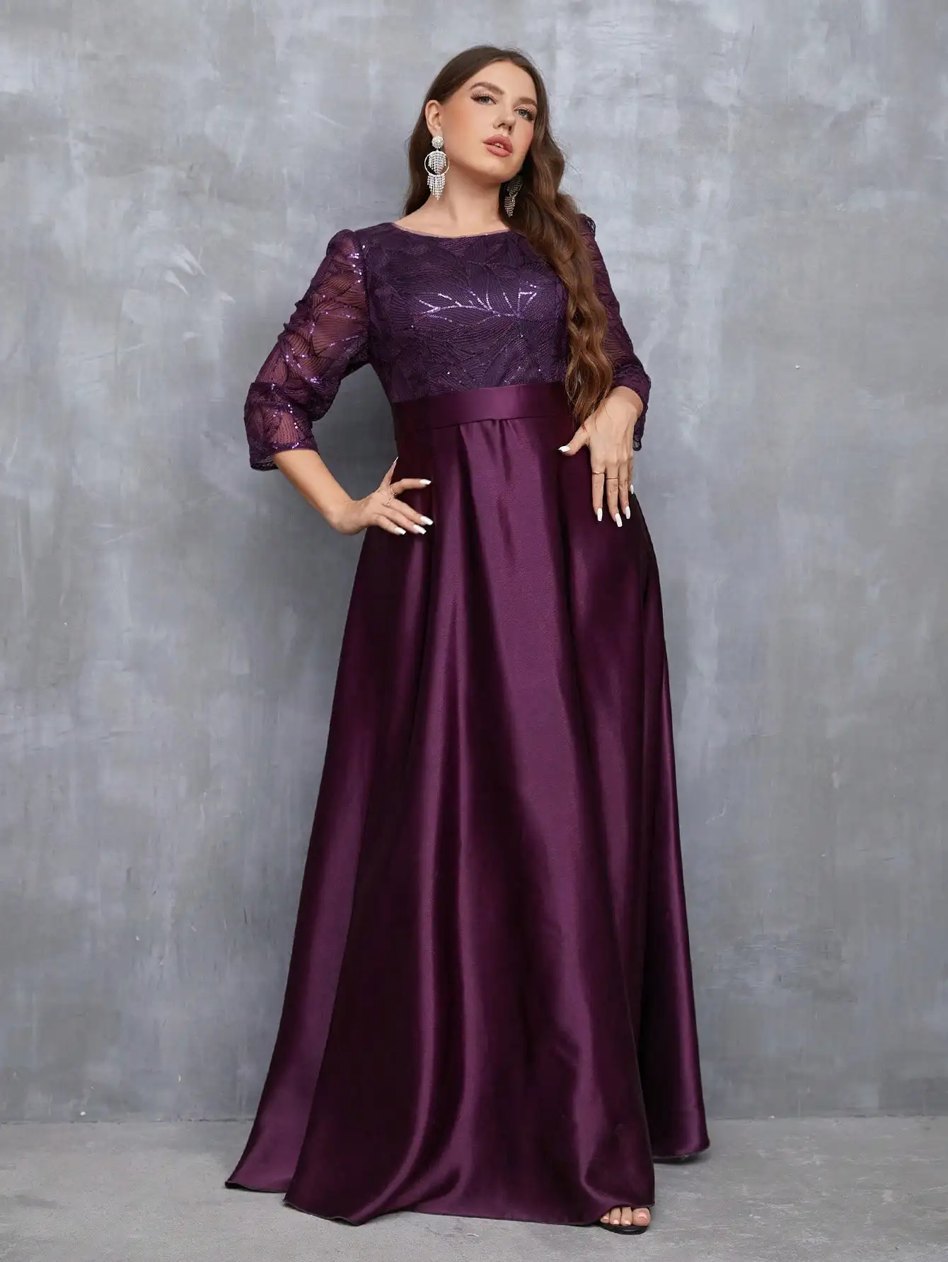 Mgiacy Crew Neck Long Sleeve Sequin Patchwork Satin Long Gown Ball Gown Party Dress Bridesmaid Dress